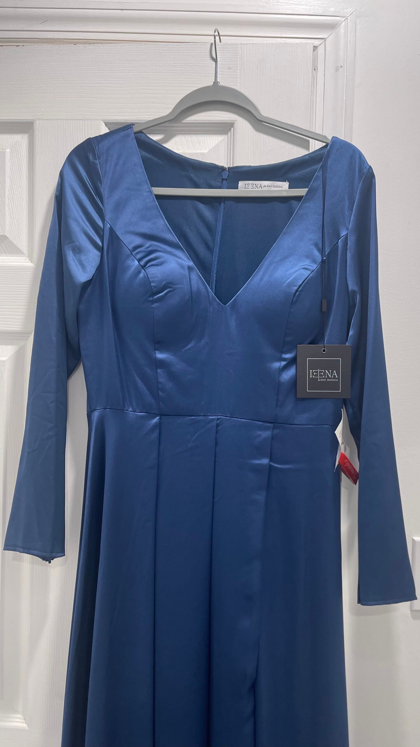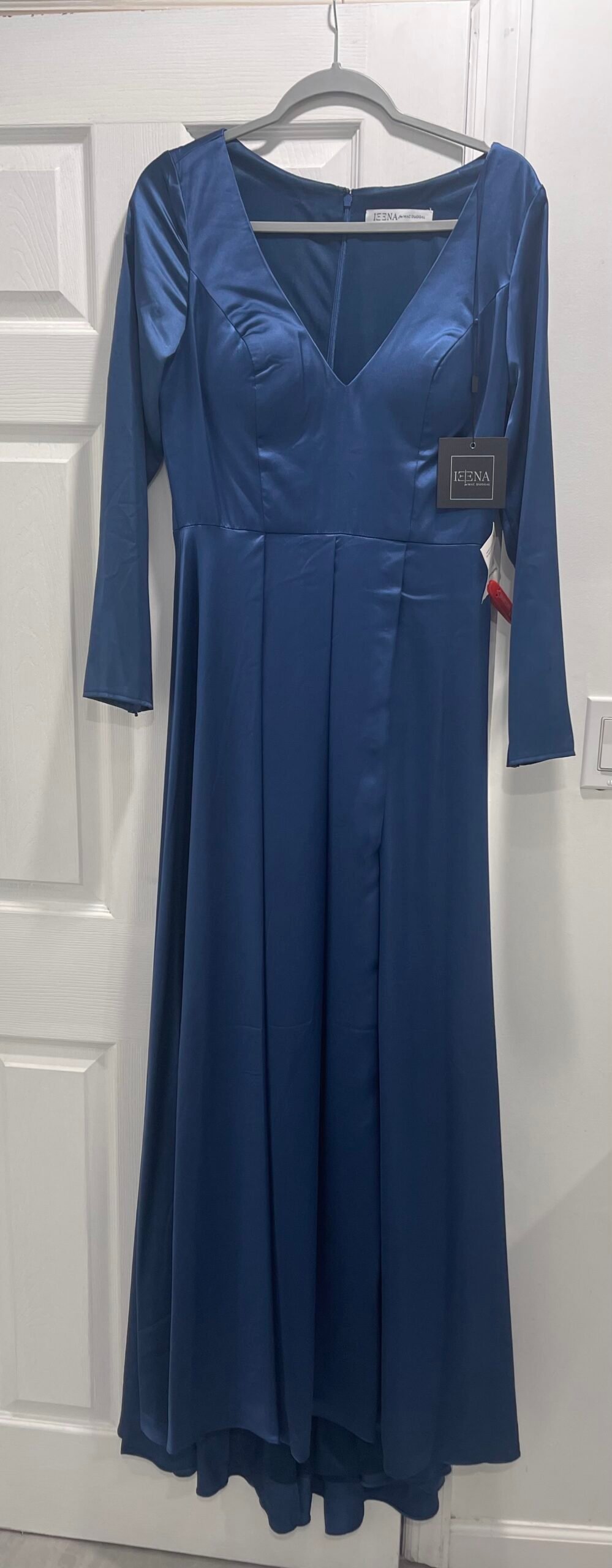 Ieena Mac Duggal 26613 Vneck Long Sleeve Satin Gown SZ 8 Midnight Blue