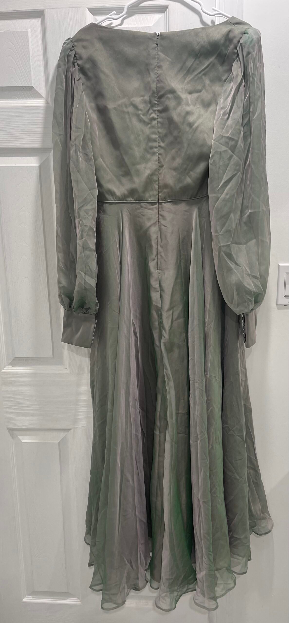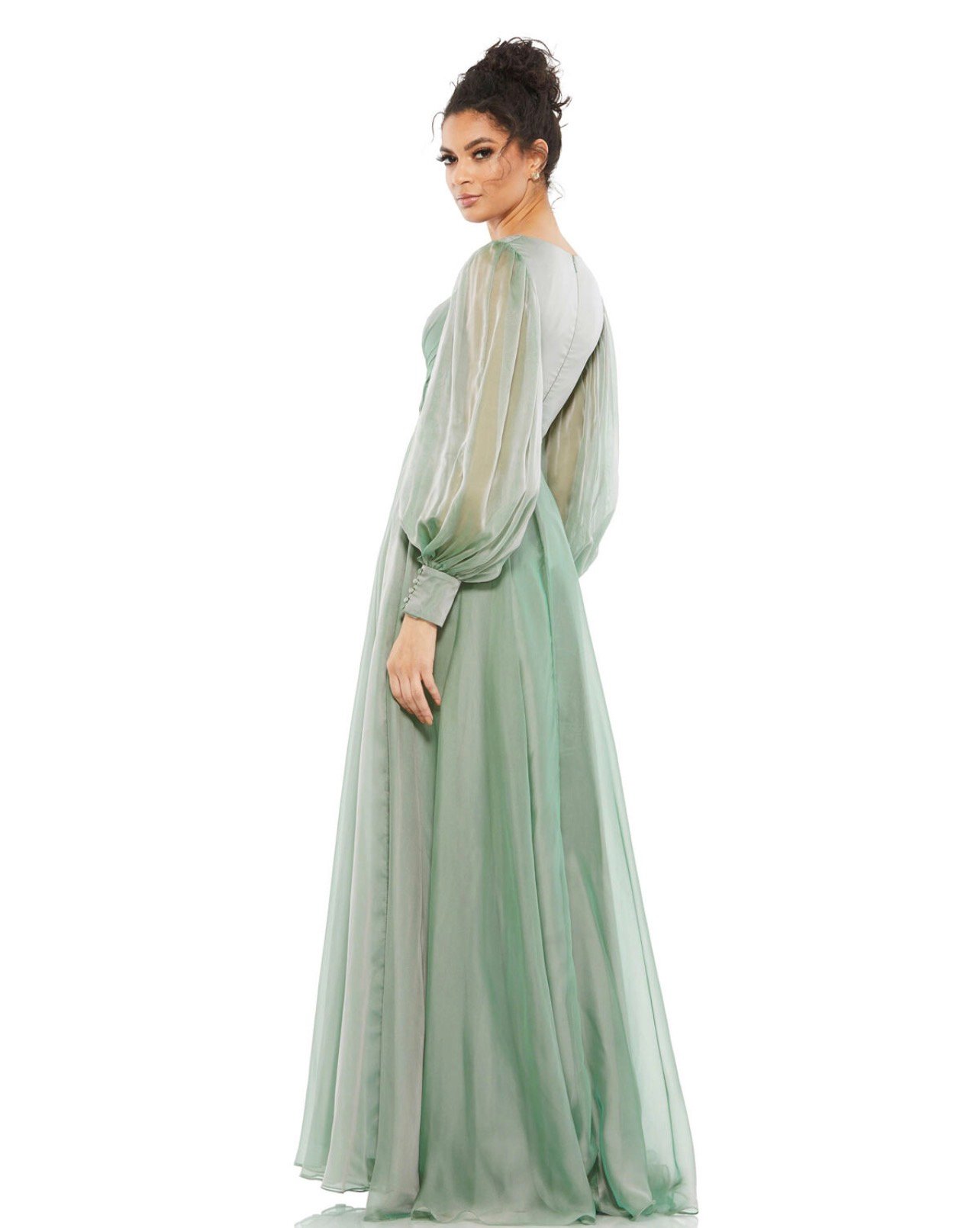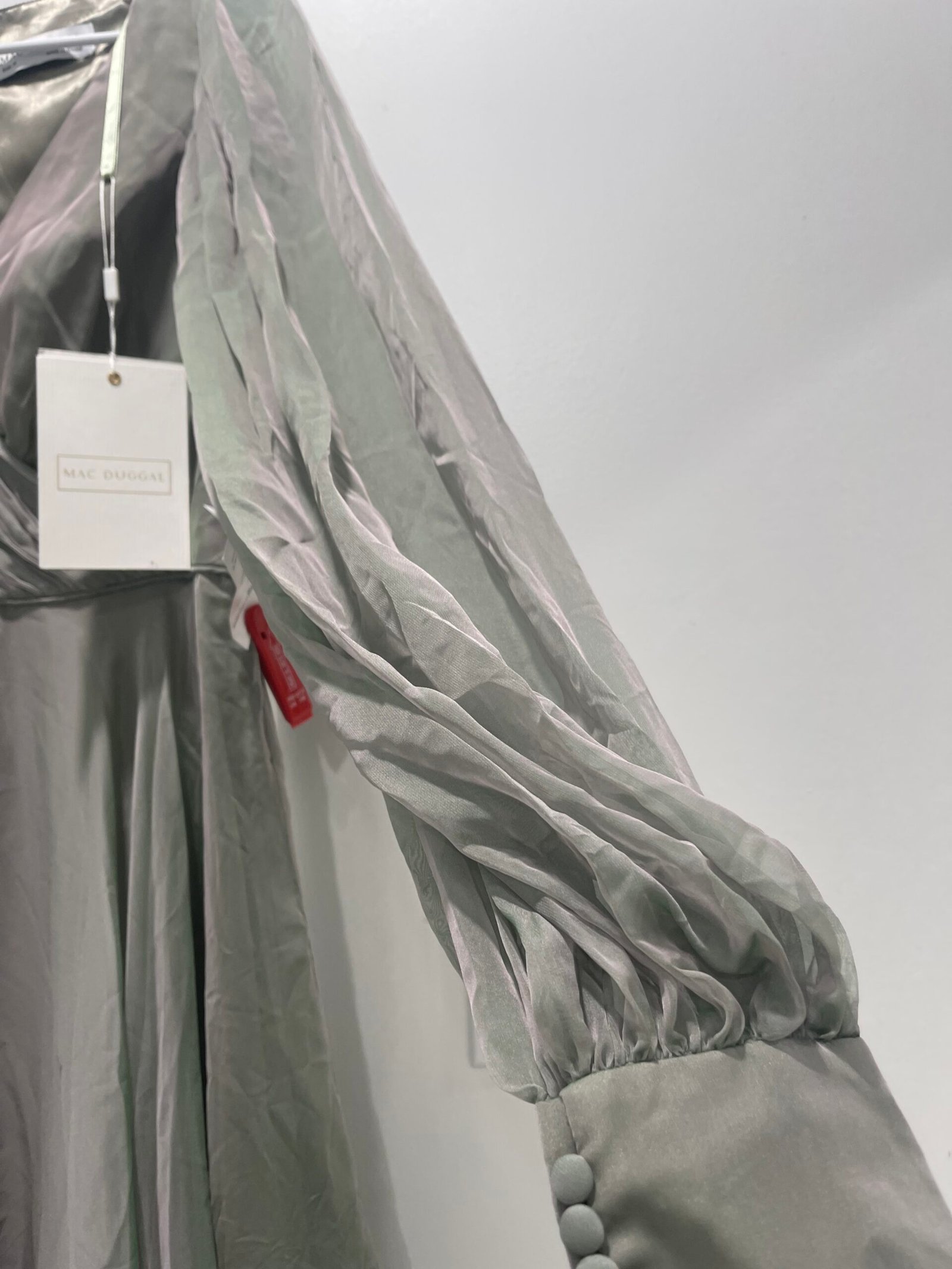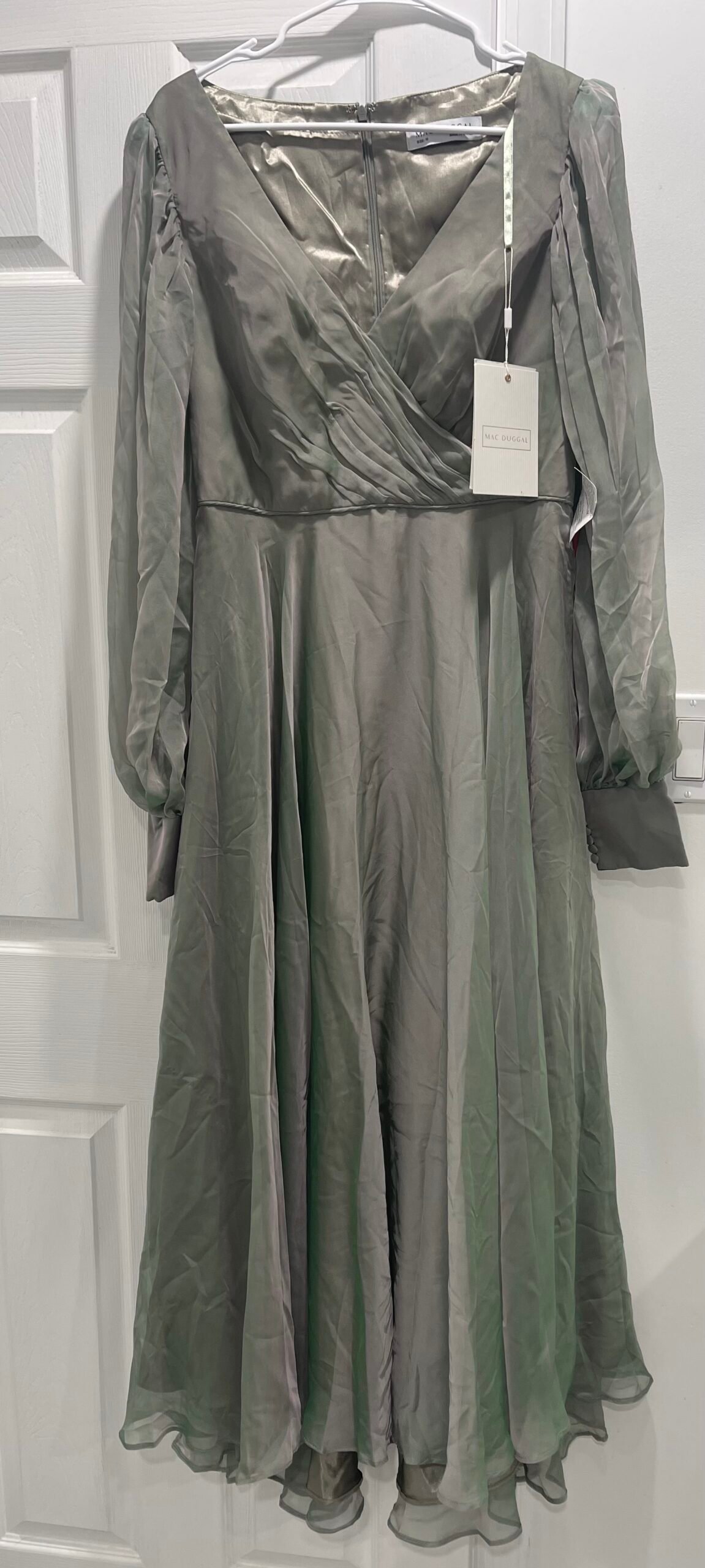 Be the first to review “Mac Duggal 67873 Sheer Blouson Sleeve Surplice Chiffon Gown Sage Green Sz 10”