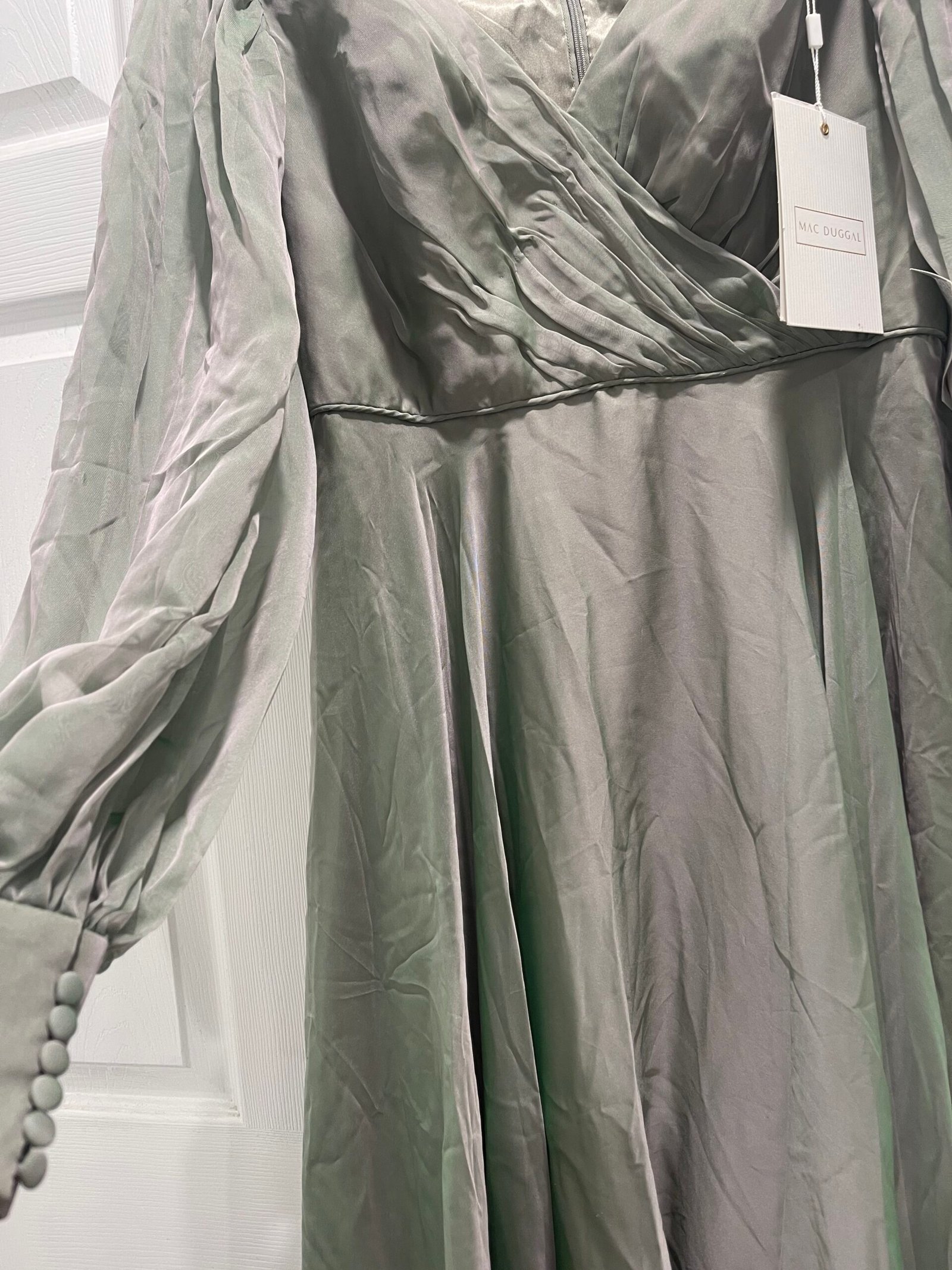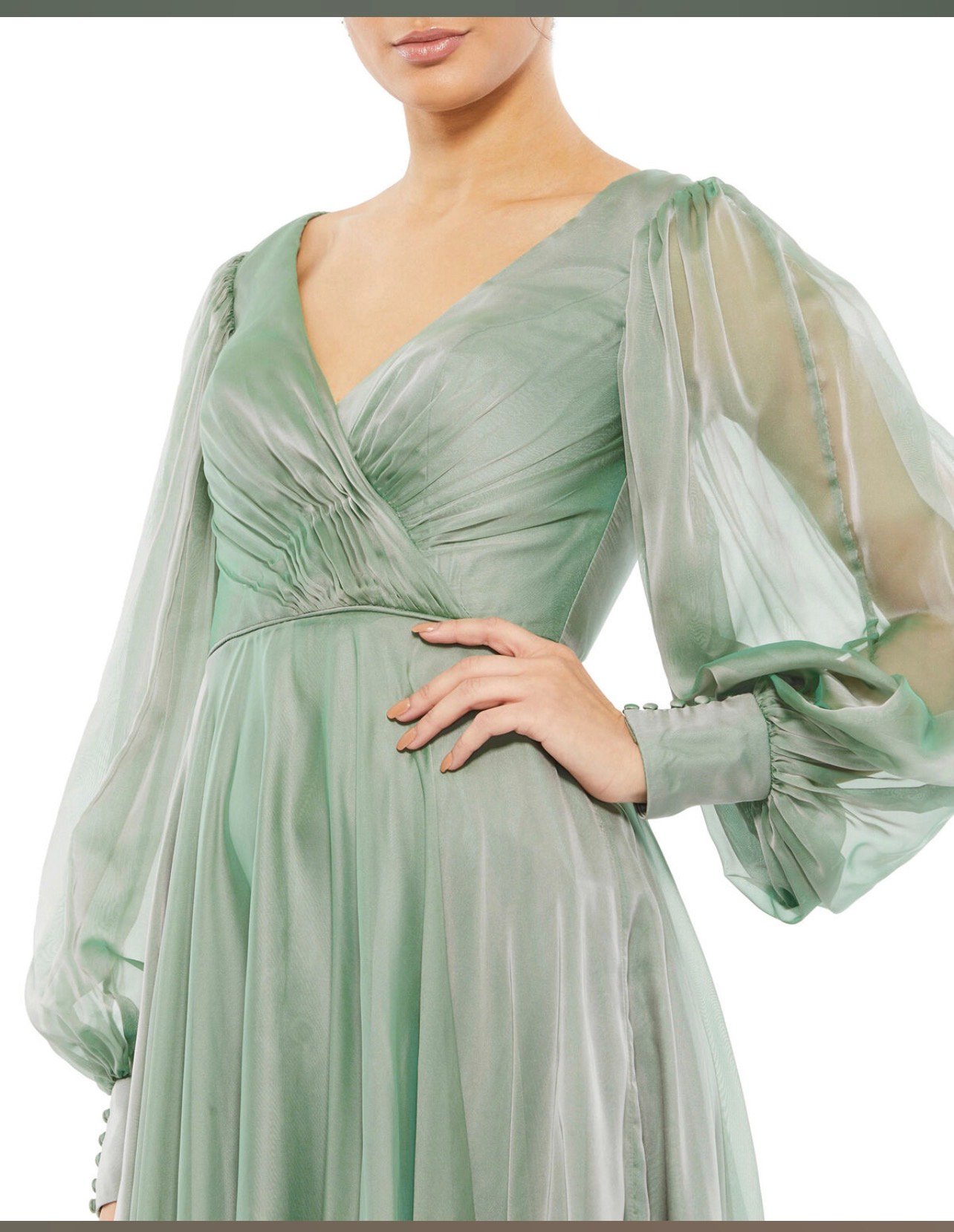 Mac Duggal 67873 Sheer Blouson Sleeve Surplice Chiffon Gown Sage Green Sz 10