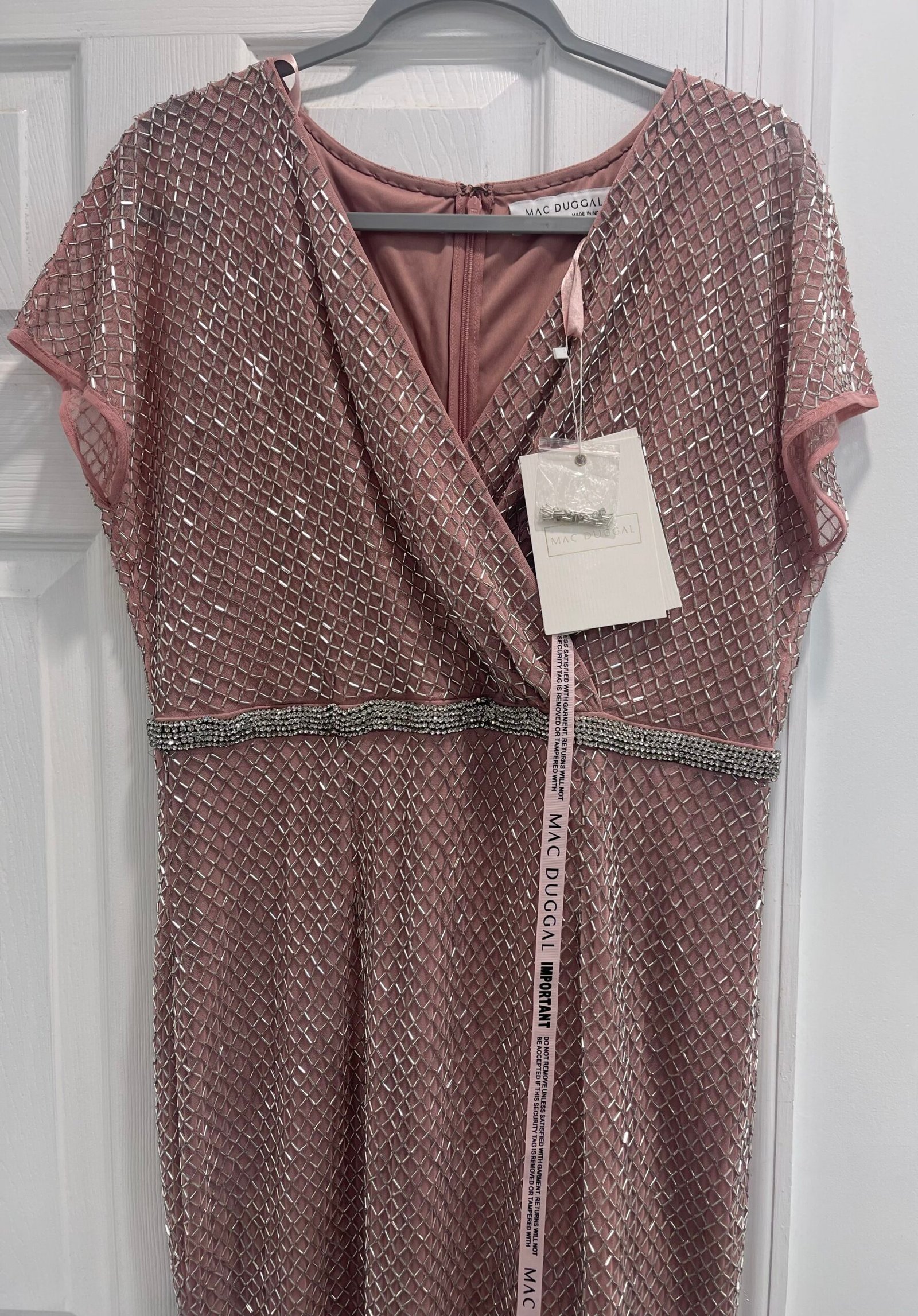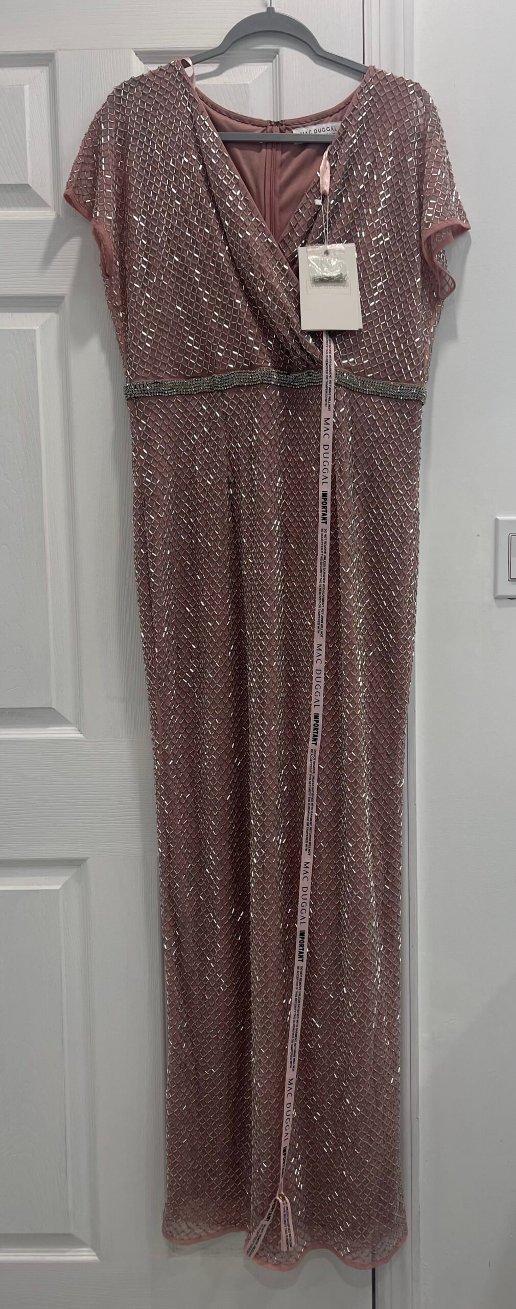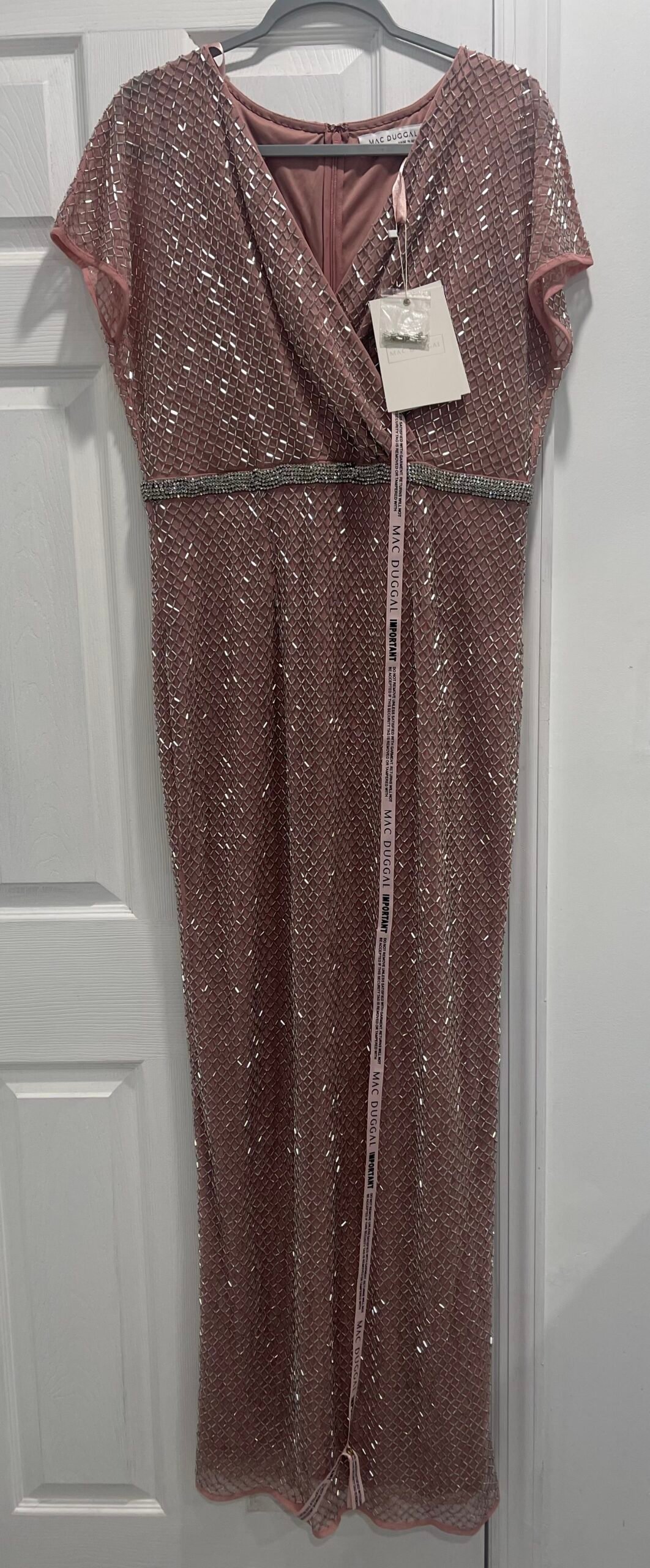 Mac Duggal 93787 Pink Beaded Rhinestone Wrap Long Dress Sz 16 V-Neck Cap Sleeve