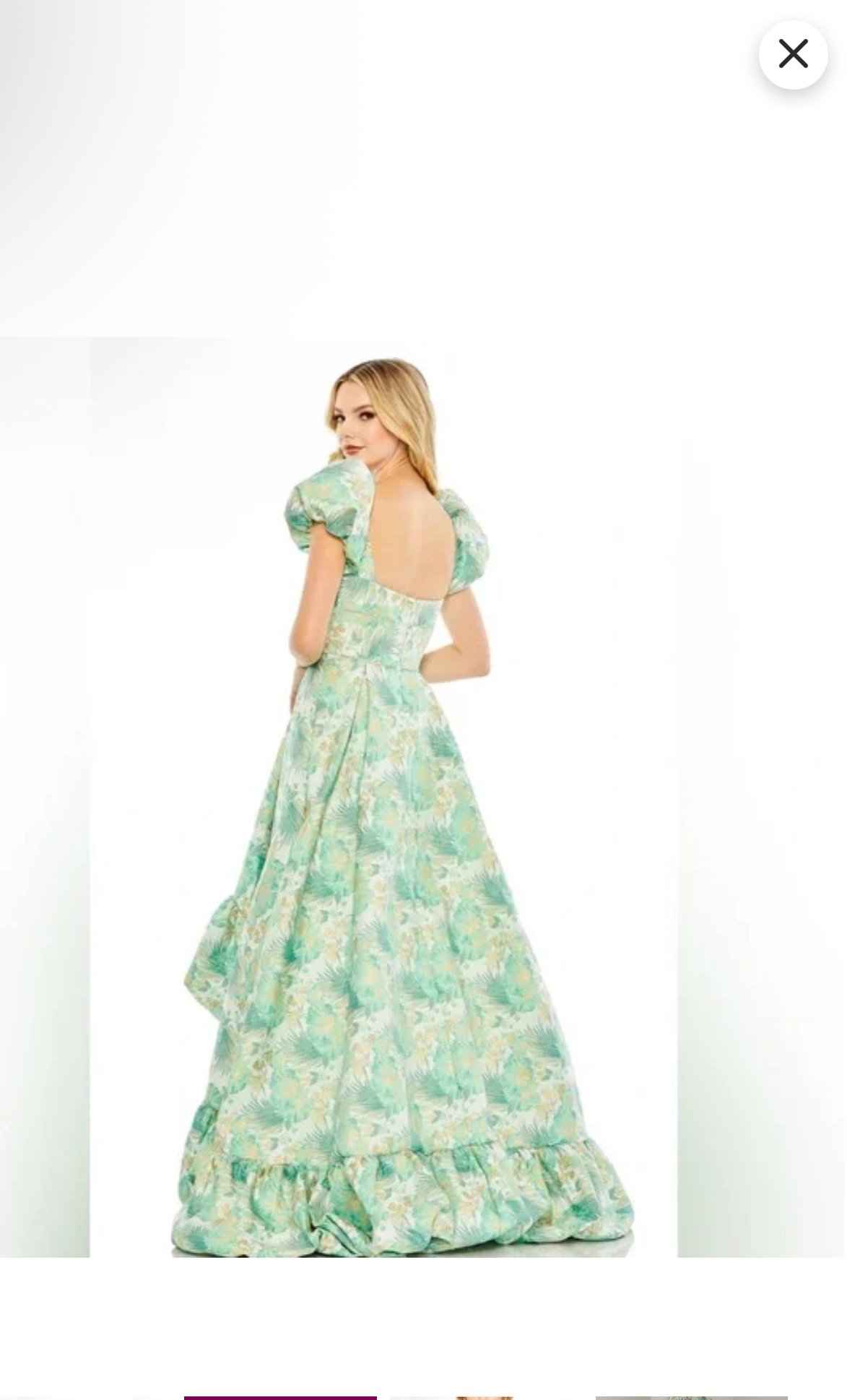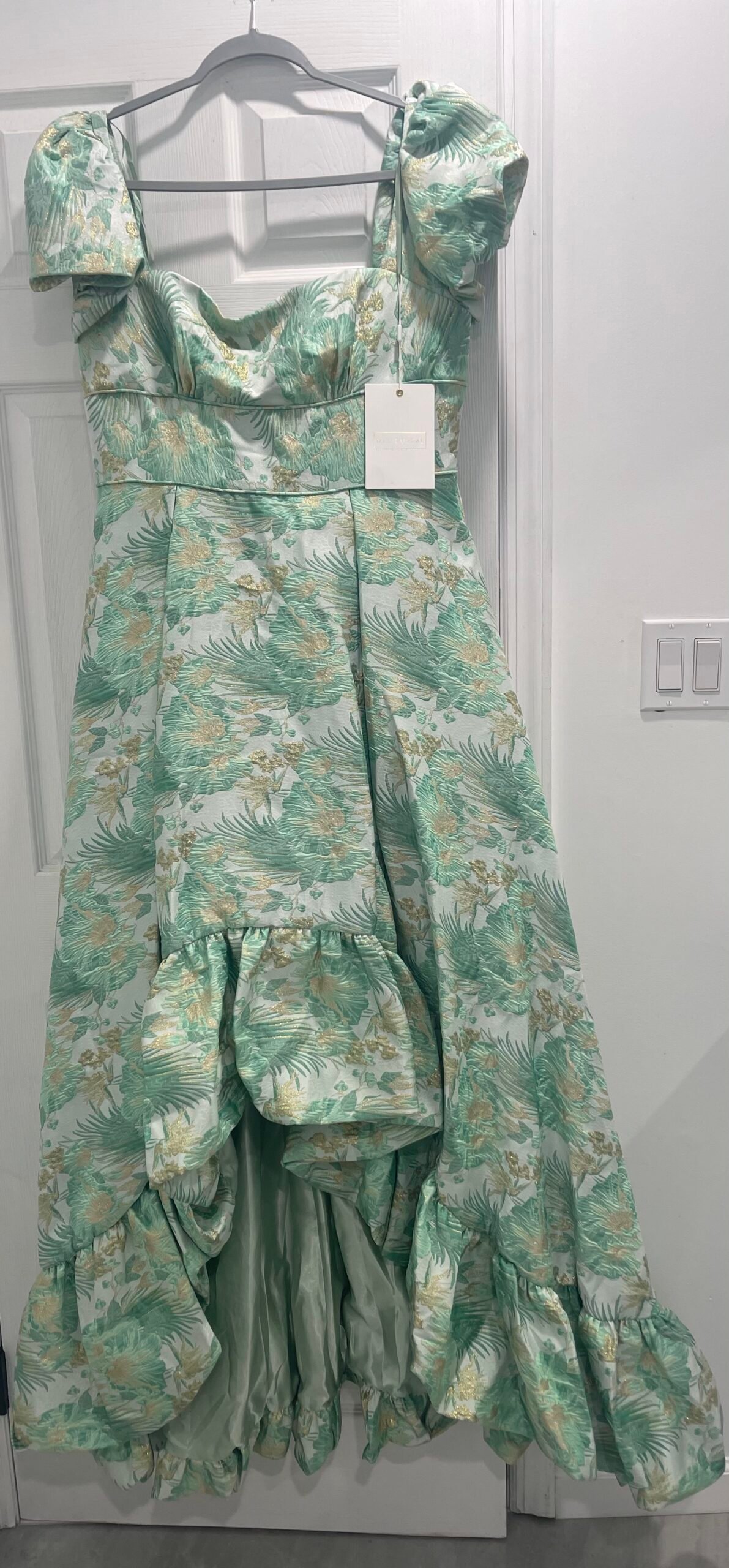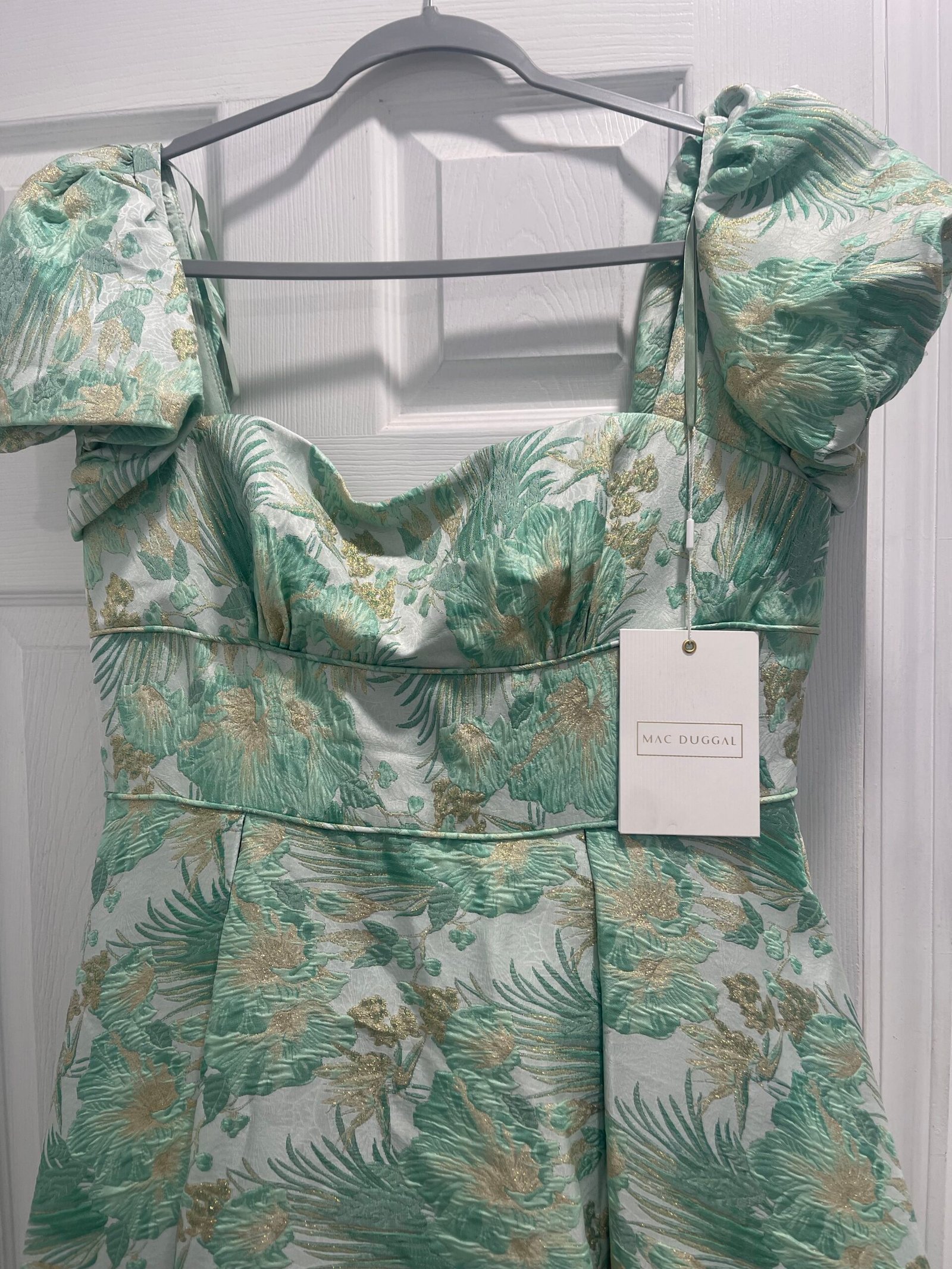 MAC DUGGAL Size 12 Green Floral Brocade 68276 Puff Sleeve High Low Gown Dress